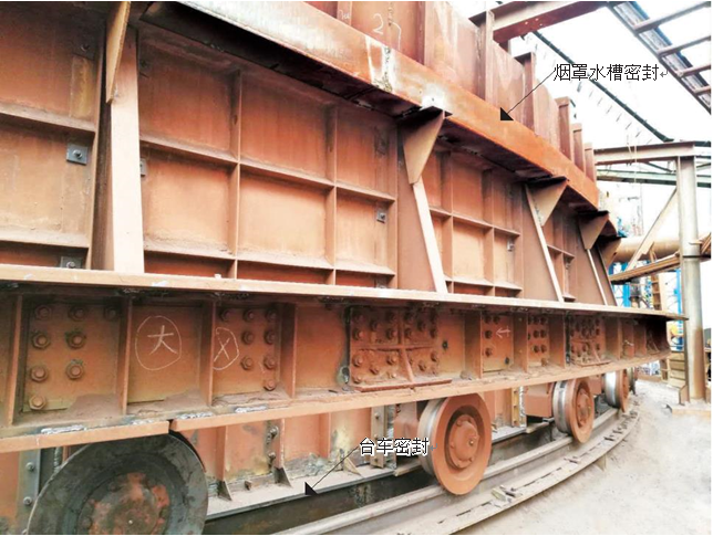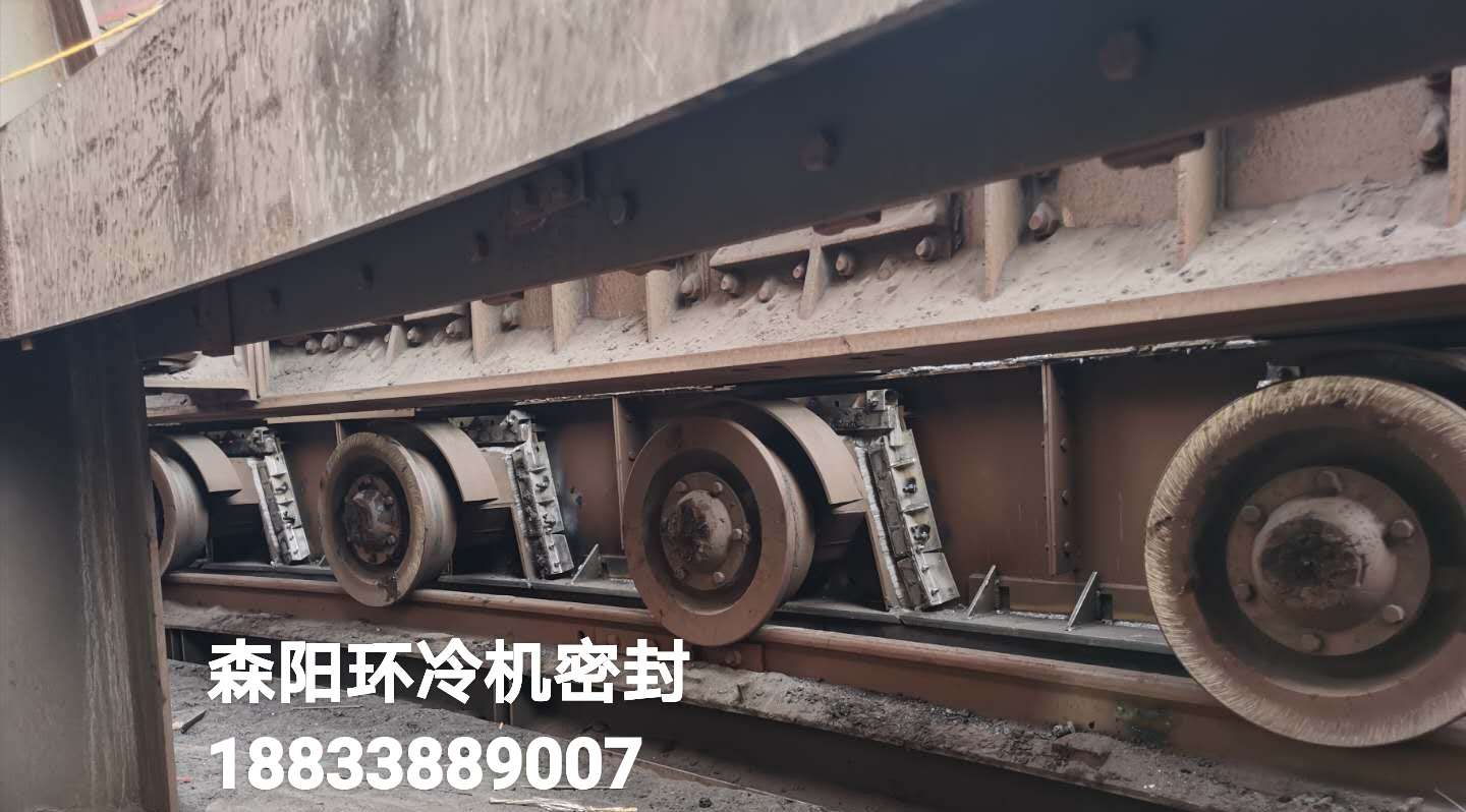 密封采用彈性可自調結構??筛鶕h(huán)冷臺車跑偏情況進行彈性調整。對環(huán)冷機底梁、臺車輪、三角梁、煙罩等位置進行有效密封。煙罩部分采用水槽式密封結構,保證煙罩圈梁始終在水槽密封內運行。密封后有效改善現場噴料、漏風。改善現場環(huán)境,提高煙氣溫度,從而增加了發(fā)電量。